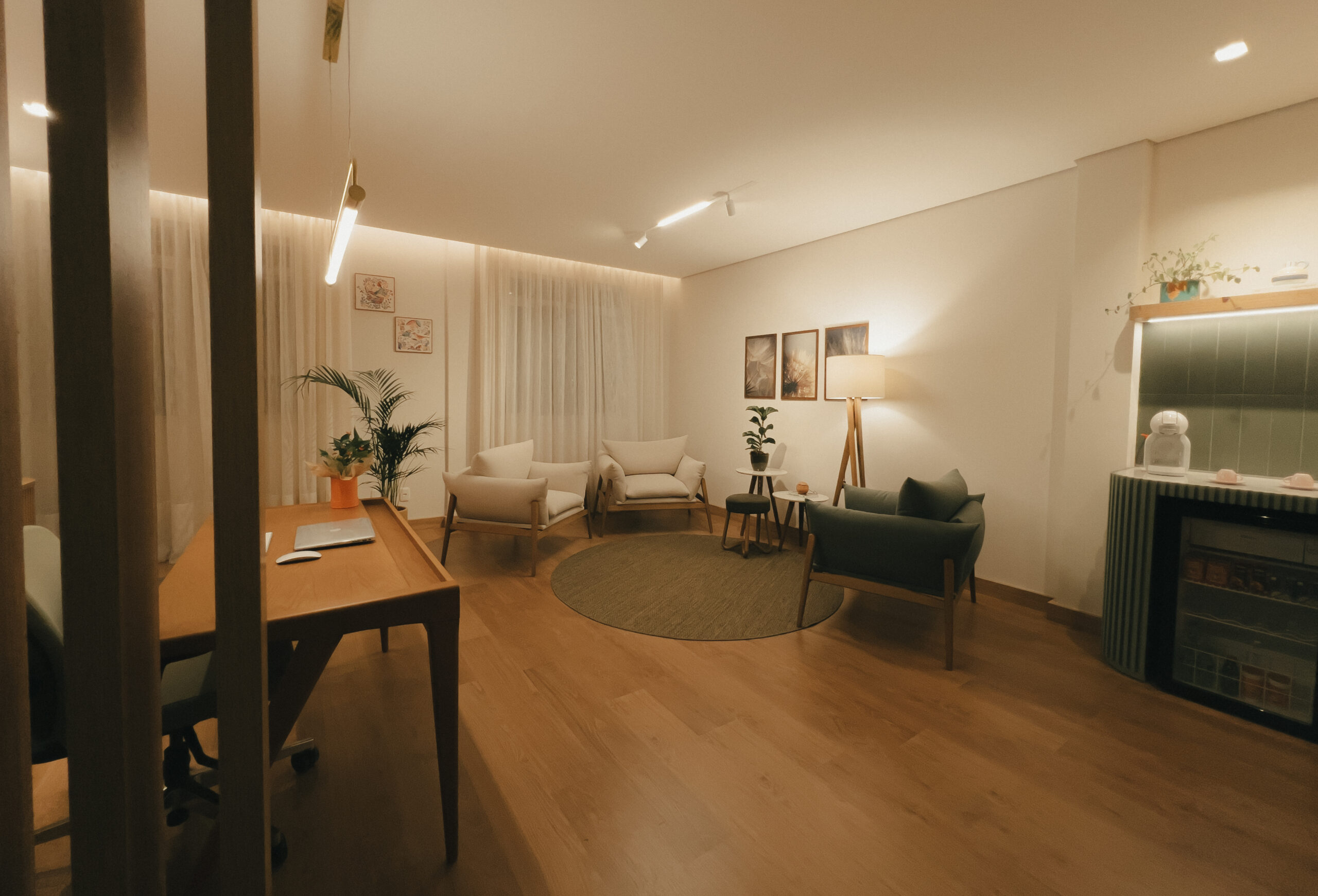 Desde o adentrar da sala de espera o projeto foi todo pensado. Receber na copa, acolher com um layout circular e, no fundo da sala, atender com a escrivaninha como ponto principal.