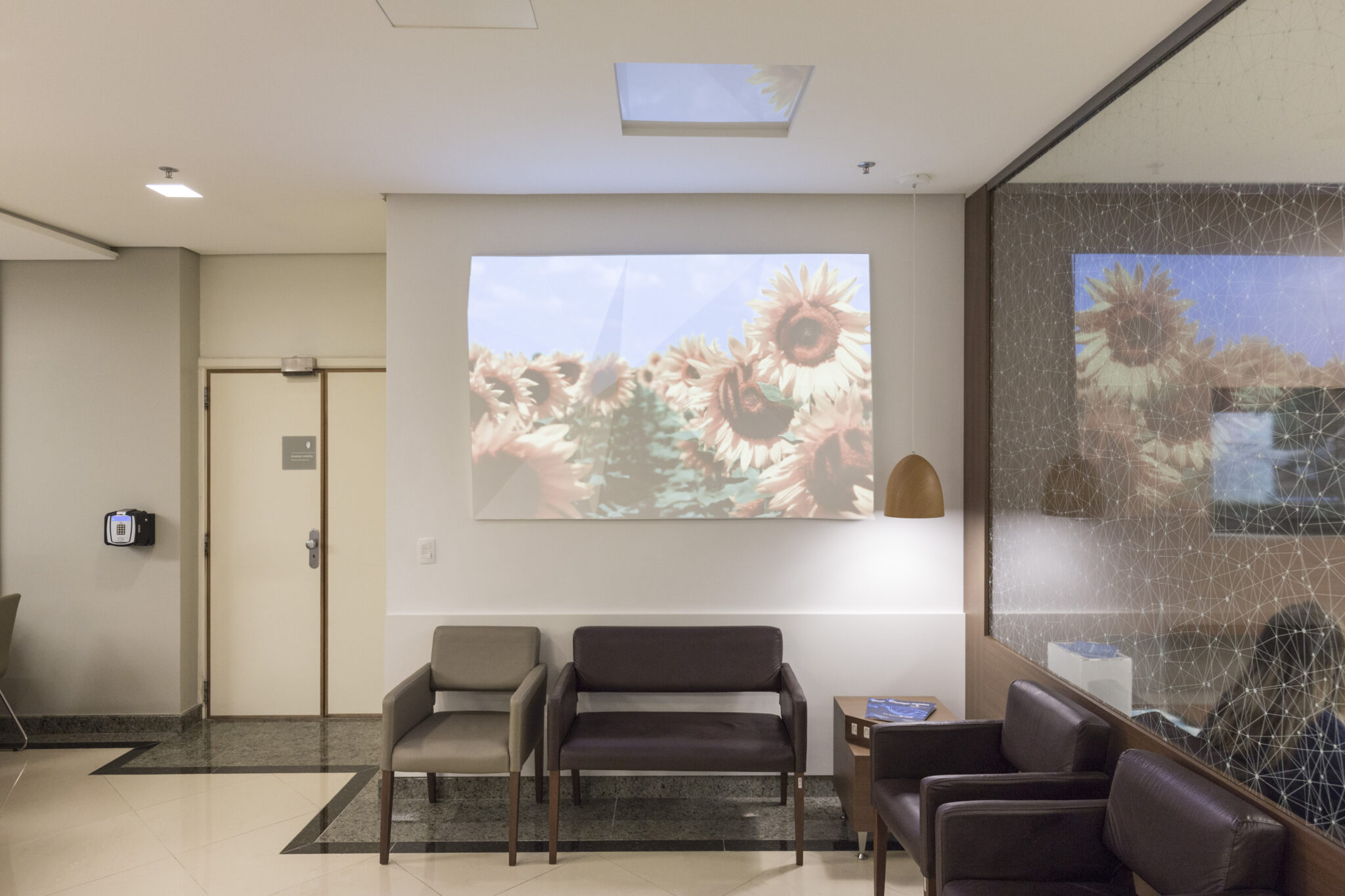 Esse projeto reviu a experiencia de espera dos pacientes e familiares em tratamento de câncer. Foi criada sinalização, quadros com telas de projeção e iluminação escultural para transmitir uma atmosfera de mais tranquilidade.